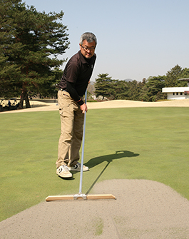 「フェアウェイは『フェア』であるべきですよね。よくゴルフ中継の映像でフェアウェイに縦方向の縞パターンがはっきりと見えてるシーンがあります。少し白く光っているフェアウェイと、緑の濃いところ。あれは見た目には美しいのですが、あれは芝目です。見た目に綺麗に映るようにフェアウェイを一定期間、同じ方向に刈り上げていくのです。すると芝目がついてああ見える。でも私はあれはフェアではないと思います。フェアウェイウッドのソールが順目にボールがあれば滑り、逆目なら引っかかる。せっかくのフェアウェイなのですからフェアであるべきではないかと・・。ですから嵐山ではフェアウェイに強い芝目がつかないように注意して作業をしています。」