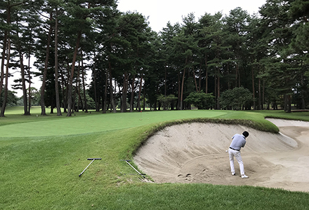 クラブハウスから右、インコース10番のスタートティの右奥の林の中にアプローチ練習場があります。ここではいつでもコースボールが用意されていて、アプローチとバンカーショットの練習が可能。スタート前の早朝、誰も居ないアプローチ練習場で鳥の声を聞きながらの練習。あるいはラウンドの後に、その日のトラブルを技術的に反省し、明日のラウンドのためにバンカーや逆目のショートアプローチを練習するなどが可能です。但し作ってしまったディボットは各自の責任で目土をすることを忘れずに。